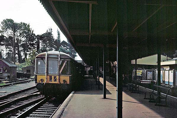 A pair of Gloucester RC&W single unit DMUs (later class 122) wait at the Sidmouth terminus in 1966.