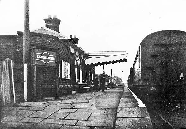 A nice photo of Simonstone's station down (eastbound) platform. The photo was taken from the west, Blackburn end of the down platform looking east towards Padiham and Rose Grove. Here a train is almost ready to depart for Burnley or Colne near to the home starter signal which is in the up or clear position. One carriage door is still open and two members of staff stand on the platform ready to assist passengers. Looking around, one or two advertisements can be seen as can five lampposts towards the eastern end of the platform, these posts and two larger lamps were all lit with oil due to the fact the station had no gas supply. The two larger lamps are either side of the booking office exit onto the platform itself. Above the exit onto the platform is the short ugly replacement awning, the original one spanned the length of the building, no details of when this replacement awning was erected. As for the date of the photo, it is from the early British Railways era. The carriages of the train look to be the older LMS ones but that doesn't help with dating the photo as they were used well into BR days. Near the bottom left of the photo you can see the original LMS Hawkseye station name sign and the advertising boards have LMS on them but they are painted out. I checked another photo from a book which was taken in 1957, the poster next to the name sign was still there. The platform here has a white line on the platform's edge but this line is not there in the 1952 photo. The only thing we can possibly say is that this photo looks to be from around 1956/57. The poster seems to have survived until closure of the station in November 1957.