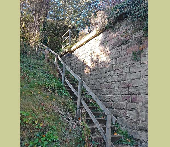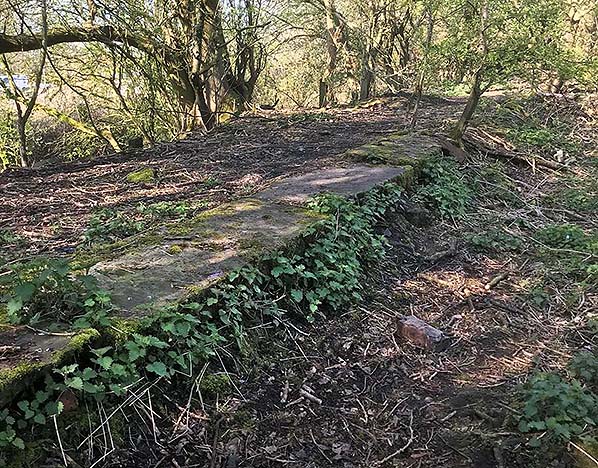 The western edge of what was the railway bridge crossing over Simonstone Lane which led directly to the station on the other side. The bridge stone abutment still stands and a set of wooden steps have been provided for walkers which leads to the Lane. As viewed, the left side is the up line side looking westt.