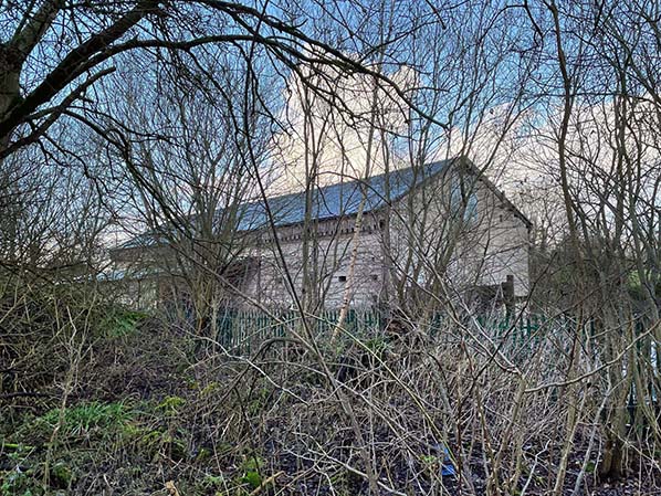Behind the bare trees in December 2022, Simonstone goods yard shed still stands. This is the original shed built of wood in 1885. It is located behind what was the down platform building just off to one side at the Rose Grove (eastern) end of the station. The shed itself was open fronted and originally a siding ran through it. This photo shows an extra portion has been added to one side of it (date unknown). This extra structure is not shown in the original drawings of the shed and its purpose is unclear. In front of the trees is what's left of the down platform, a mixture of rubble and bricks covered with undergrowth and dead branches. The shed itself is on private land, and the view is from the Rose Grove end of the station. Simonstone goods shed is sadly the only surviving station area building from the entire North Lancashire loop line.