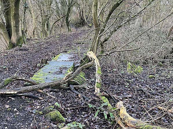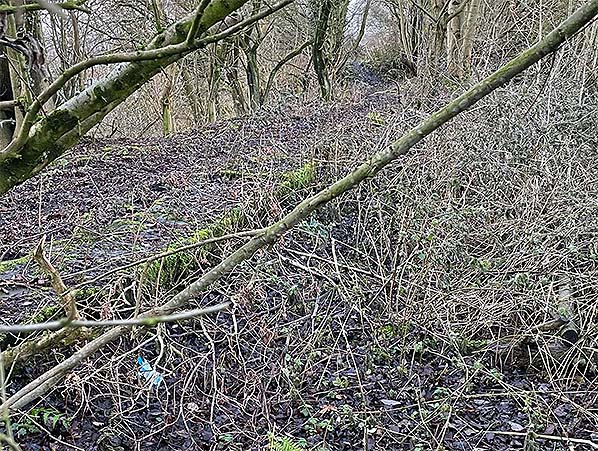 The up (westbound) platform edge of Simonstone station still there in December 2022. It's quite remarkable how it has survived all these years, some 57 years after the station was demolished, and 65 years since the last passenger train stopped. Here in the winter months the platform edge is quite visible but in summer it could easily be completely hidden away beneath the vegetation, perhaps one reason why it's survived so many years. The view is looking west towards Simonstone Lane.