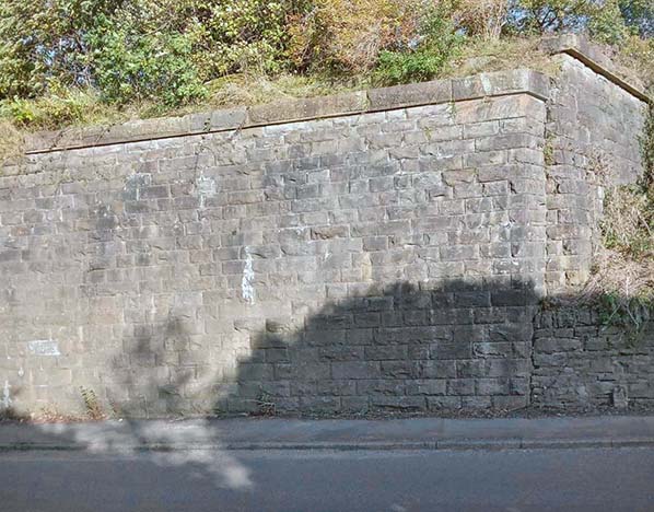 The eastern end of the railway bridge over Simonstone Lane. At the top of the stone abutment trees can be seen growing. This is where the platforms began for the station. As viewed, the right side is the up line side looking east.