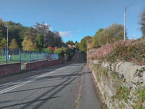 Looking north up Simonstone Lane. The trackbed to the left ran to Great Harwood in the west, and the right led directly to the station in the east. The two stone abutments for the former bridge can be seen in the centre of the photo where Simonstone Lane dips down. The bridge here was removed and cut up 30 May 1968.