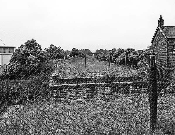 Taken from the former station site at Simonstone in 1974, here we are looking west towards the village of Read and Great Harwood. The bridge here over Simonstone Lane was removed in May 1968, and either side of the missing bridge is fenced off for safety. The stone bridge in the distance carries Gooseleach Lane over the former line.