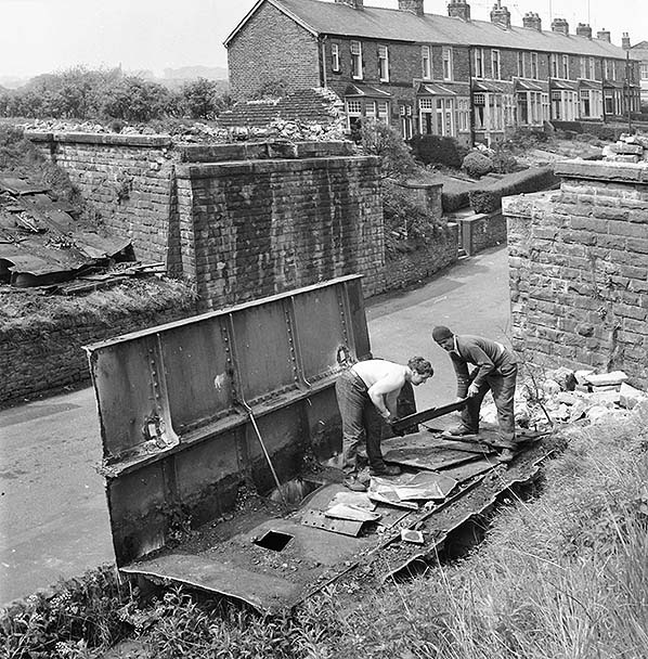 Two men are cutting up the remains of the railway bridge that spanned Simonstone Lane on 30 May 1968. The bridge stone abutments still stand and are clearly visible. This view is from the station side (east) looking west. The row of houses was known as Bank Terrace.