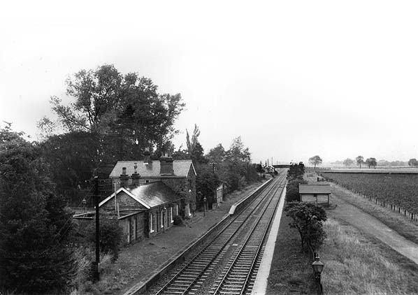 The main station building on the down platform was 'L' shaped and comprised a two-storey stationmaster's house at its north end and a single-storey booking office and waiting room with a hipped roof and a flat-roofed toilet block at the south end. The station opened on 2nd June 1852 but apparently, permanent station buildings were not provided until 1854. The up platform had a timber waiting shelter.