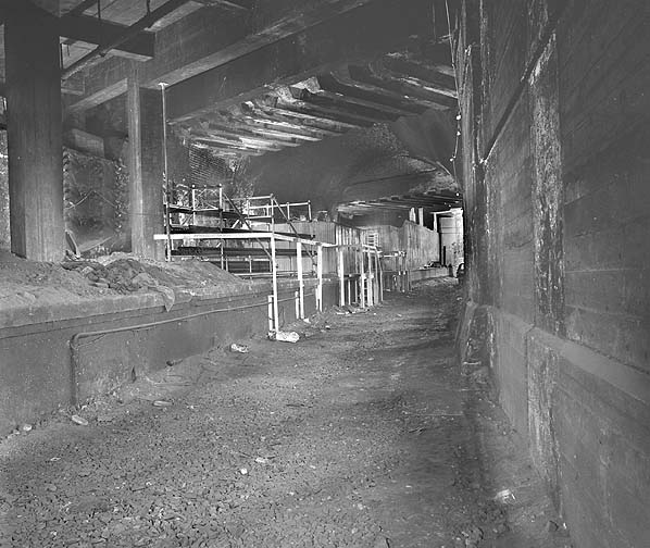 Holborn Viaduct Low Level Station (east platform) looking south in December 1980. During this period there was new office construction in Farringdon Street and the track bed was used for works huts and car parking. Photo by Nick Catford