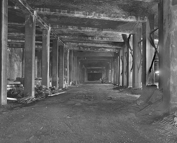 Looking south along Snow Hill Tunnel towards Holborn Viaduct Low Level Station in April 1981. The lit area to the right is Farringdon Street Goods Depot. Photo by Nick Catford