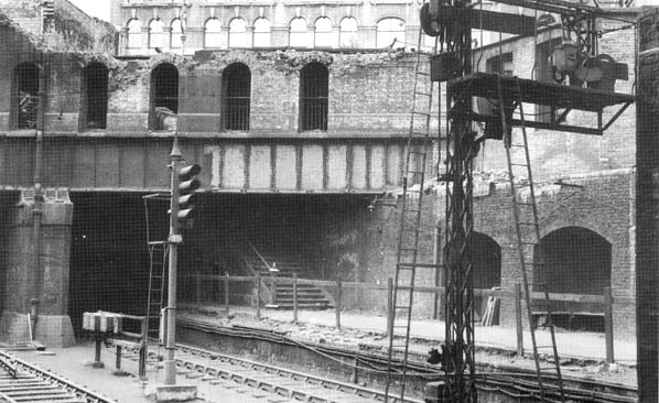 Looking South from Holborn Viaduct Low Level Station in July 1954 the remains of the basement level of the the bomb damaged station building can be seen. Photo by J. Smith