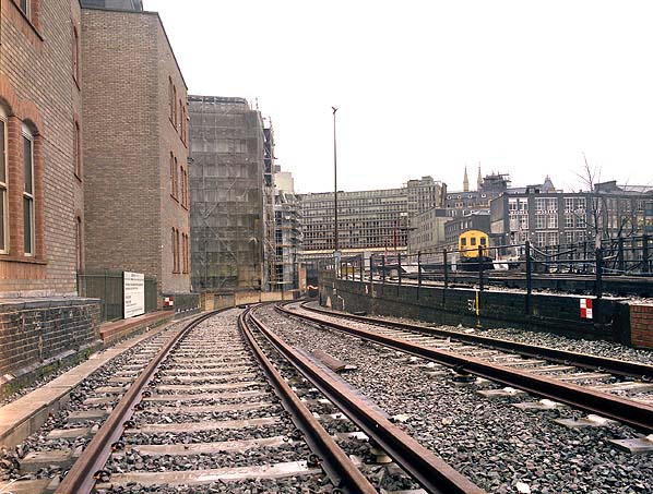 The incline down to Snow Hill Tunnel on the left and Holborn Viaduct Station on the right in December 1986 Photo by Nick Catford