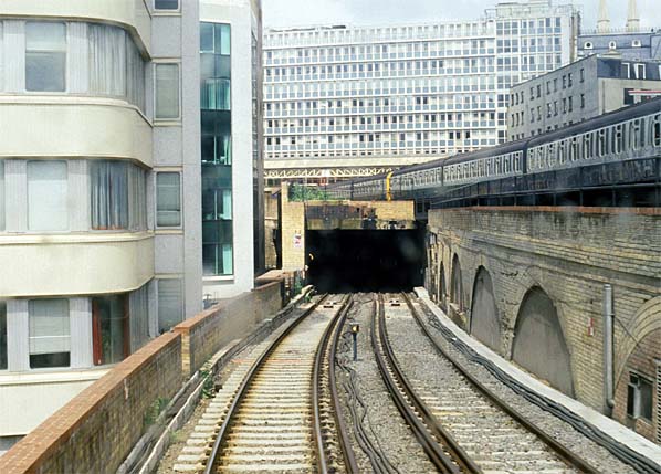 The south portal of Snow Hill Tunnel with Holborn Viaduct Station on the right seen from a train cab in 1988 Photo by Simon Foster from Abandoned Tube Stations web site