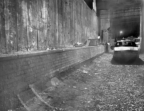 Holborn Viaduct Low Level Station (east platform) looking south in December 1980. During this period there was new office construction in Farringdon Street and the track bed was used for works huts and car parking.