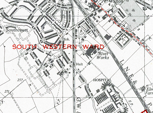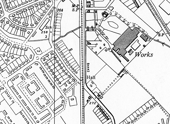 ![]() 1949 1:25,00 OS map. This map shows the Southcourt residential development, the Bifurcated and Tubular Rivet Company works and Stoke Mandeville Hospital are seen. The halt was provided in 1933 to serve them. During the First World War the works manufactured rivets for soldiers’ boots and tyre studs, and during the Second World War the rivets were used in aircraft and bomb casings.