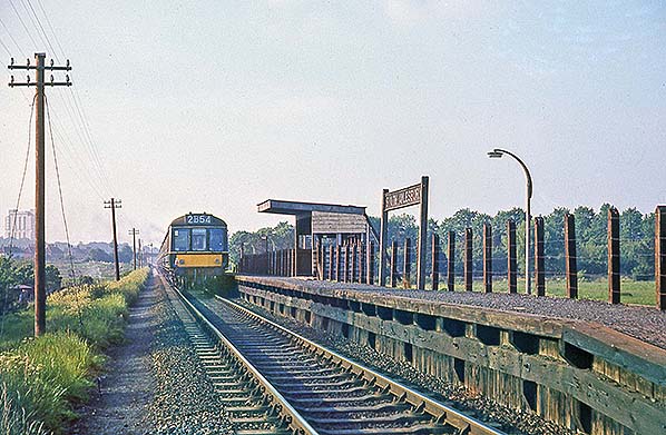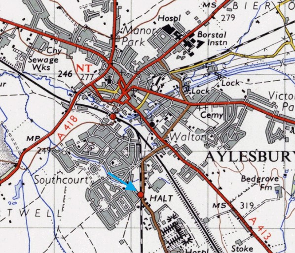 Photo from John Mann collection ![]() On 31 May 1966, a year before closure, a diesel multiple-unit (DMU), apparently an 8-car formation, pulls away from South Aylesbury Halt and will shortly arrive at Aylesbury Town (once known as Aylesbury Joint), a mere three-quarters of a mile away. The headcode, 2B54, notwithstanding it being on the rear of the train, signified a Marylebone to Aylesbury via Princes Risborough service. Shuttles between Aylesbury Town and Princes Risborough carried the headcode 2B94. The DMUs are what came to be known as Class 115. Built at Derby, they were 4-car high density units with 4 x 230hp Leyland Albion engines per unit, making them somewhat more 'gutsy' than units fitted with the standard 150hp BUT (AEC/Leyland) engines. Albion was a Glasgow concern largely involved in the manufacture of commercial road vehicles, being taken over by Leyland in 1951 but the Albion name continued in use until 1972. Class 115, as it became, was operated in various areas of the country in the early years following its inception in 1960 and also during its final years which came to an end at Tyseley (Birmingham) in 1994. Otherwise Class 115 was intended for and spent the bulk of its working life on suburban services out of Marylebone and for that reason the class was known to rail enthusiasts and some railway staff as "Marylebone units". Until 1966 there were also some workings to Nottingham Victoria and return, most famously the 08:38 ex Marylebone (headcode 1D33) and 12:30 return (headcode 1B95). A number of cars, power and trailer, survive in preservation but as of 2021 only a couple of power cars are in running order. One final point of interest is that the Aylesbury - Princes Risborough line was destined to become the final haunt of what are now known as First Generation DMU's in public service on the National Network. The final pair, single unit railcars 55020 and 55034 (121020/34), finally bowed out on 19 May 2017. Both had, however, been refurbished and reinstated from departmental service. The original purpose of the halt was to serve the Southcourt housing estate, some houses of which can be seen in the left background. The line here was parallel with Mandeville Road, indicated here by the electric street lighting; this was considered adequate to illuminate the platform as no other lighting was provided in later years. The photographer is standing on the foot crossing over the line which gave access to the platform. The path connected Old Stoke Road with Mandeville Road and it is possible it was originally a level crossing for road traffic.
