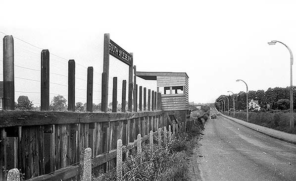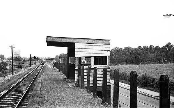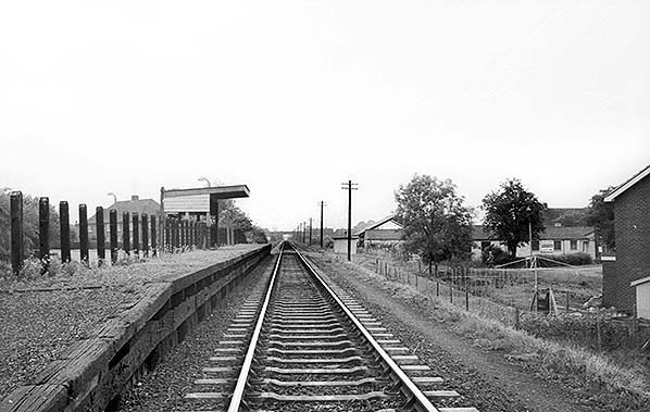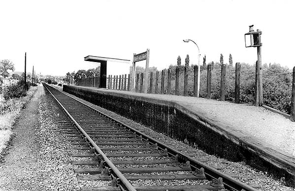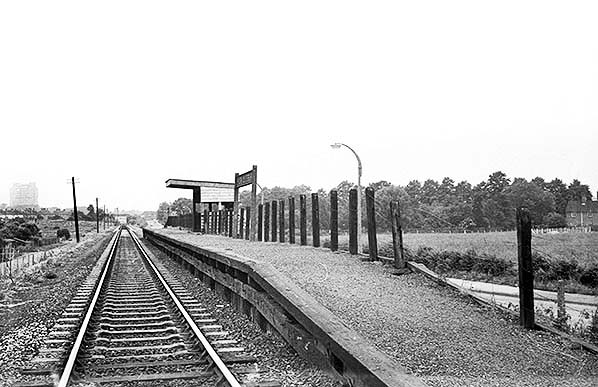 ![]() South Aylesbury Halt looking north towards Aylesbury in June 1960. This is believed to show the station as built, no earlier photographs have so far come to light. Mandeville Road runs parallel with the line. The Concrete Utilities street lighting dates from the 1930s and provided sufficient light so no additional platform lights were necessary.