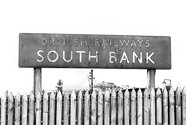 A BR(NE) tangerine vitreous enamel sign at the entrance to South Bank station in November 1972.