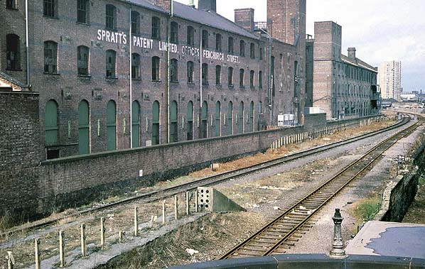 Looking north from South Bromley station in 1969. Spratt's Patent pet food factory, built in 1899, still stands today and has been converted into luxury apartments.