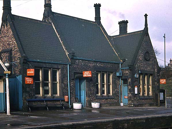 The station building on the down (west) platform at South Gosforth. This Gothic-influenced Blyth & Tyne structure dates from the opening of the station in June 1864. Although decades of soot encrust it, the various ‘tangerine’ signs installed by BR(NE) add some relief, including the ‘Ambulance Station’ sign, below ‘Gentlemen’. The LNER’s contributions are the swan-neck lamp standard and nameplate. The photograph was taken in February 1964.