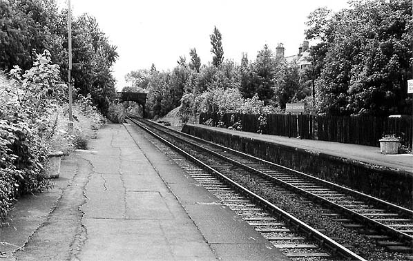 In the summer of 1973 or 1974 the southern end of South Gosforth station is seen from the up platform. The former garden on the bank (left) which was previously tended as a garden is now neglected. Since the mid 1960s the signal box, further down this platform, and the siding behind the opposite platform have been removed.