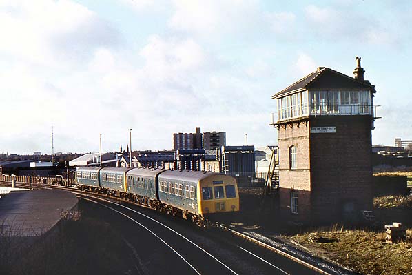 On 24 December 1977, viewed from the footbridge at the end of Hunters Road, a class 101 DMU rounds the curve on its way from South Gosforth to Longbenton. To the right of the tall South Gosforth (East) are the Gosforth car sheds. South Gosforth colliery formerly occupied the area in the centre of the photograph where there are now industrial units, and until the late 1960s there were sidings here.