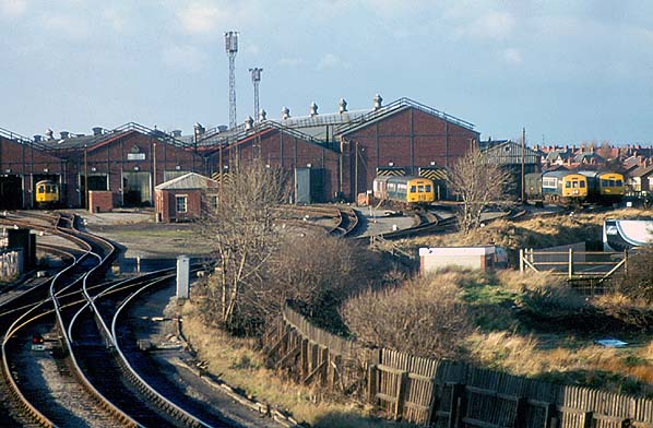 Gosforth car sheds, looking west on 24 December 1977. The sheds, whose design was drawn up by the NER, were opened in October 1923 by the LNER. They were to house and service the EMUs following a fire at the Heaton sheds which had destroyed some of the fleet. Immediately north of the sheds, Gosforth Garden Village was built to house the employees and their families. As seen here, when the electric trains were withdrawn the sheds, which had already begun to house DMUs continued in this role.
