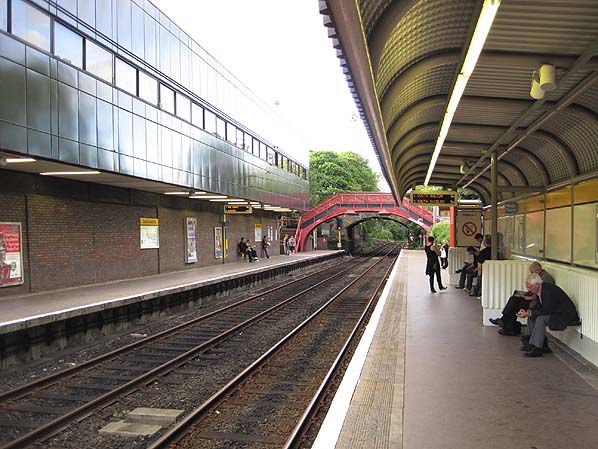 Looking north along the up platform at South Gosforth in July 2010. The Metro control centre is to the left and a standard Metro open shelter is on the right. The NER footbridge and B&T Station Road overbridge are in the background.