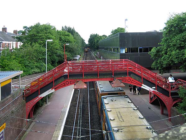 Looking south from the footbridge at South Gosforth. Nothing remains of the Blyth & Tyne buildings, but the North Eastern Railway footbridge has been retained. The Metro control centre is beyond the footbridge, to the right. The distant down train is close to Ilford Road station, one of the new ‘halts’ installed by the Metro in 1980.
