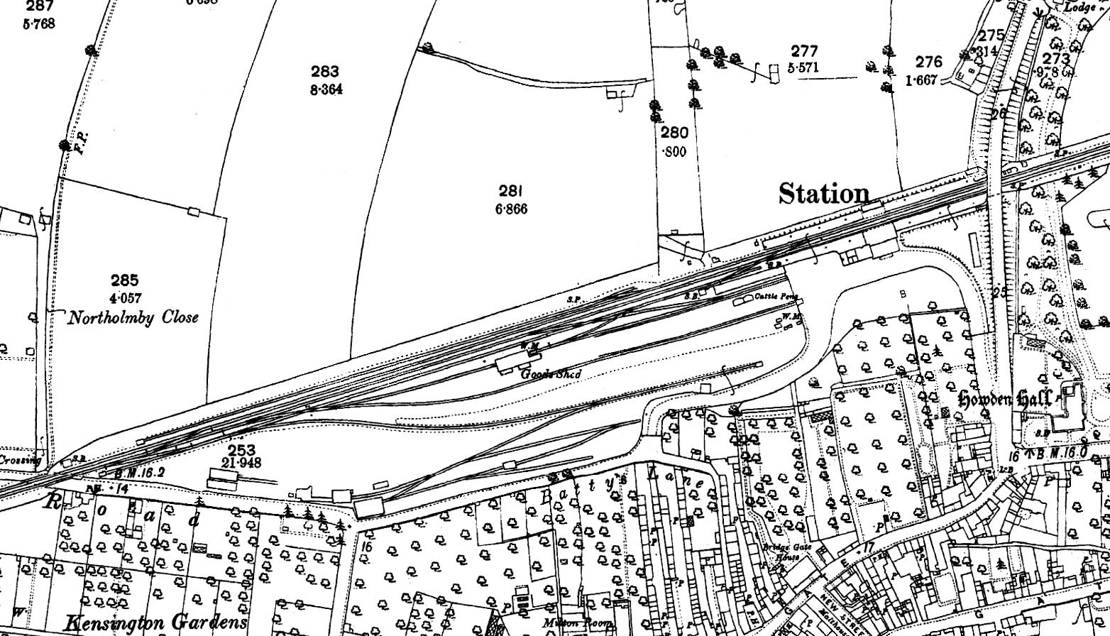 1890 1:2,500 OS map shows the layout of the station and goods yard. Tthree sidings run behind the up platform, that closer to the main line running through a goods shed to terminate at a cattle dock. A number of sidings and sheds are also seen in the south side of the yard. One of the sheds has a short section of track that doesn't appear to be connected to other sidings. These were probably the remains of a base used by the contractors building the H&B. The railway opened in 1885; the map is dated five years later but in reality was probably surveyed a couple of years earlier, so it is very likely some builders' infrastructure remained - the isolated shed with stub rail is a typical indicator. One of the sheds was almost certainly for locos. The station had two signal boxes, one at the west end of the up platform, the other on the down side to the west of the goods yard.