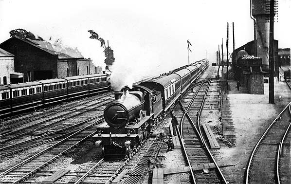 ![]() An express service from Paddington approaches Southall station before December 1911. The goods shed is seen on the left. The motive power depot is seen on the far right. There is a water tank on top of the coald coaling stage and behind it is a water softener tower.