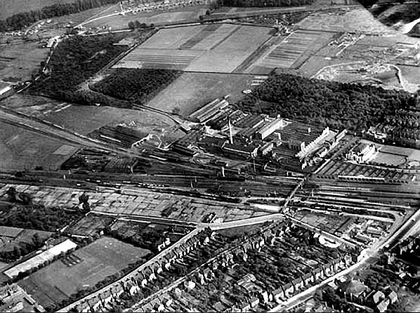 ![]() Aerial view of Southall station and the massive Maypole Dairy to the south in May 1930. The factory which opened in 1894 eventually grew to become one of the largest margarine manufacturing plants in the world, occupying a 69 acre site at its peak.The triangular building on the right is the railway loading shed for the dairy. The motive power depot is seen left of centre.