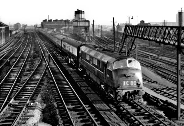 ![]() By 1960 main-line diesel-yydraulics were handling many of the principal Western Region expresses. Here No. D823 'Hermes', a Swindon-built 2,200hp Type 4 B-B (introduced August 1958), is heading the 12.30 West of England express from Paddington, having just passed Southall motive power depot, seen in the distance with the branch from Brentford coming up on the right. A water tank on top of the old coaling stage is seen to the right of the first coach; behind it is a water softening tower. This replaced the 1902 tower seen in some other pictures.