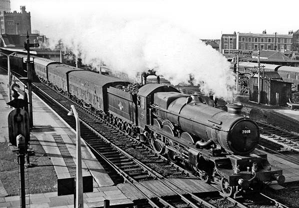 ![]() 7018 'Drysllwyn Castle' seen with class C headlamps heading east through Southall in October 1961. Built at Swindon Works to C.B. Collets design developed from the Star Class, it entered service in June 1949 and was fitted later with a double-chimney. It lasted in service until withdrawal from 81A, Old Oak Common shed on 17 September 1963.