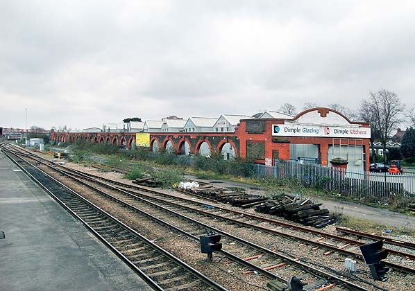 The Maypole Dairy railway loading shed seen from the disused Brentford branch platform at Southall station in March 2013.
