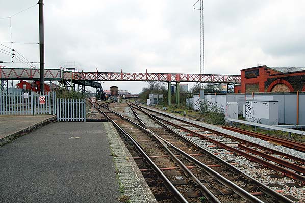 ![]() Looking east from the disused Brentford branch platform at Southall station in March 2013. The original GWR water tank on top of the old coaling stage is extant and is seen under the bridge. The motive power depot is seen in the distance.