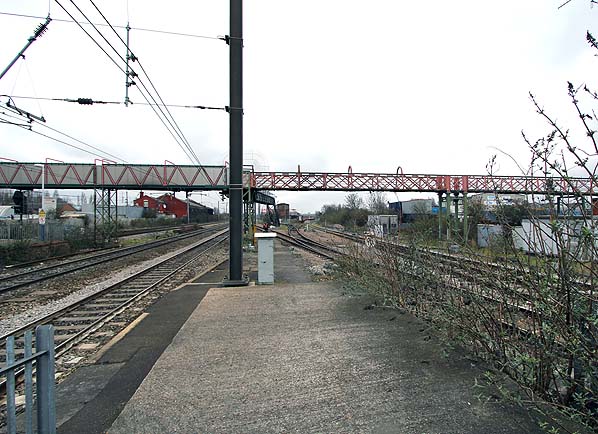 Looking east from the end of the Brentford platform at Southall station in March 2013. The old goods shed is seen in the distance on the left.