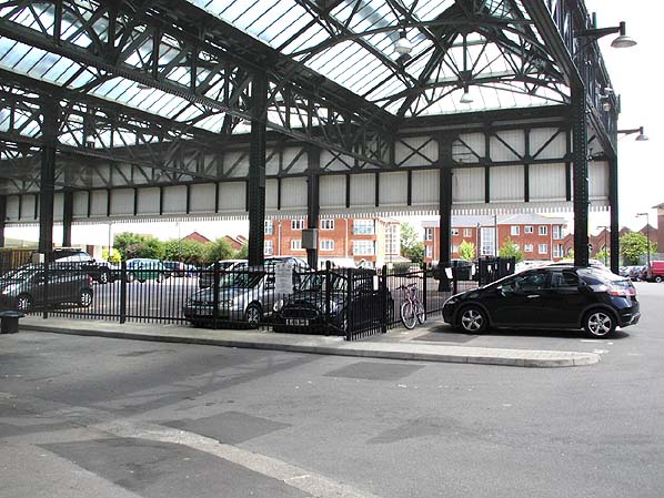 Looking north from the station concourse in June 2009, the platforms ran throgh the housing now seen in the background.