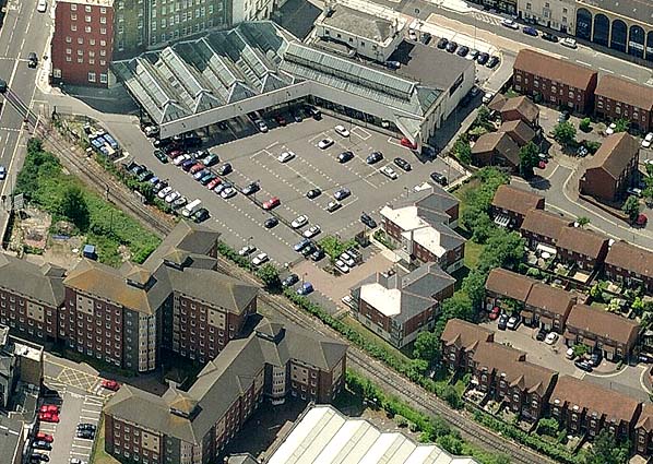 ![]() Station Name: SOUTHAMPTON TERMINUS![]() Recent aerial view showing Southampton Terminus, the main station building and covered concourse are extant but the platforms have been removed. The north end of the platform area is now a car park, with the site of the platforms roughly indicated by the marked parking bays. The north end of the station site has now been redeveloped.