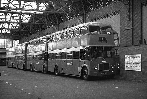 Buses of the Ribble company seen parked on the site of Southport Lord Street station's platform 1 in the 1970s.The former railway station became a bus station for Ribble in 1957.