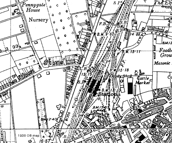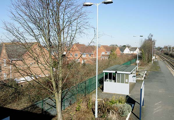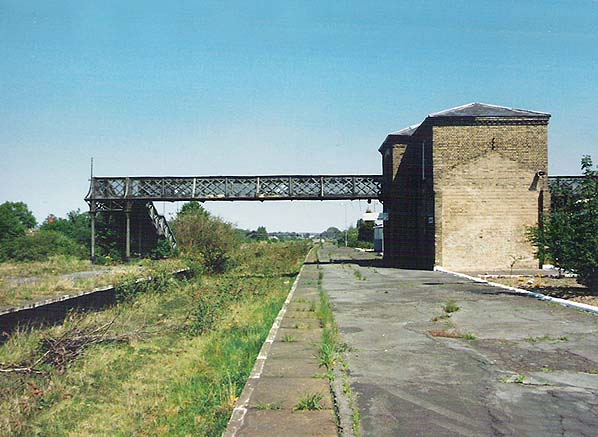 Present state: | Today Spalding station is a shadow of its former self. The site of the goods yard is now occupied by a busy road which now passes the front of the station. The majority of the buildings on Platform 1 are still there and still look majestic. Platform two has a fence down the middle of it to separate it from its derelict face (Platform 5) which is now overgrown and inaccessible. Platform 2 has a basic open fronted waiting shelter. The original footbridge still spans the two platforms although it is no longer covered. The skeletal framework of the bridge now devoid of decking and steps crosses the derelict trackbed between Platforms 5 & 6 but the arch in the brick tower has been bricked up to prevent access. The west island platform (6 & 7) has been demolished and replaced by a new housing development . (Jubilee Close and Truro Way) |