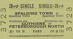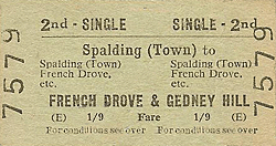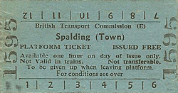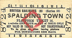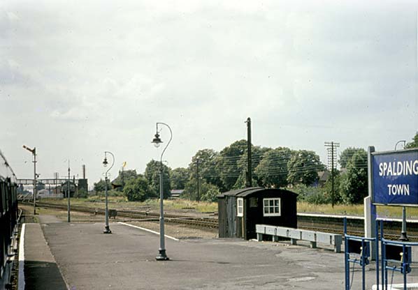 Spalding station was designed by John Taylor, opening with the loop line on 2nd October 1848; initially the station had two facing platforms. The main station buildings were on the up platform and included a booking office and three storey station master's house, similar in style to others on the loop line. The station was substantially rebuilt and resignalled during the construction of the GN & GE Joint line and in its final form had five through platform faces and a bay comprising the original main line down platform and two wide island platforms with a bay set into the north end of the middle platform. A covered footbridge spanned all the platforms. Platform 1 was the original down platform, the through faces of the middle island platform were Platforms 2 & 5, the two faces of the bay were Platforms 3 & 4 and the west island platform was Platforms 6 & 7. Althouugh never officially named Spalding Town this name was often used in timetables, on tickets and on signs.