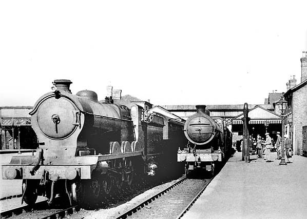 Class B5 Doncaster - March train left with a Class C1 Grimsby - Kings Cross train in Platform 1 at Spalding station in September 1933