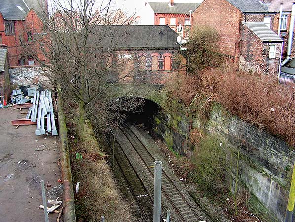 ![]() Spellow station looking west at the station booking office which is at street level on County Road in March 2008. The picture is taken from an elevated position made possible by scaffolding that had been erected as part of the Arnott Street School refurbishment works.