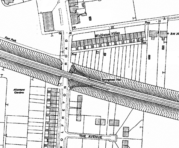 The halt closed to passengers with the line in 1955. The bridge carrying the line over Wolfreton Lane was demolished