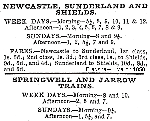 Notes: At some time between 5 September 1839 when the Brandling Junction line from Gateshead (Oakwellgate) to South Shields opened, and August 1844 when the horse-drawn Springwell service first appeared in Bradshaw, a service to Jarrow was provided on the Springwell Waggonway from an interchange station named Springwell on this line. The station is not known to have been shown in the Gateshead – South Shields or the later Gateshead – Monkwearmouth timetables.