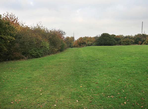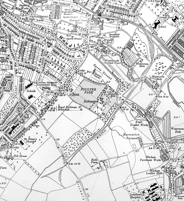 Photo by Nick Catford After completion of the estate in 1936 the line was cut back to Peterborough Road and is still shown on the 1947 1:25,000 Ordnance Survey map. Today there is little evidence of the railway. The northern section of the line almost to the River Wandle is lost under the Willow Lane industrial estate. A short stretch of the route on the north bank of the Wandle is within the Bennetts Hole nature reserve but there is no evidence of the line or of the bridge over the Wandle. On the south bank of the Wandle the course has not been developed and lies within a series of open spaces incorporated into the estate. A footpath follows the next sixty yards of the line which then passes on to the south side of a narrow wood separating the Pelhamanian Rugby Football Club from the Mitcham Rugby Union Football Club. Here the line runs in a shallow cutting, the only remaining earthwork along its course. Beyond the wood, the line crosses the south side of Poulter Park roughly on the line of an access road into the park. Form Peterborough Road the line ran a little to the north of Shaftsbury Avenue on what is still public open ground before crossing Green Wrythe Lane where the triangular junction and depot was sited on the south side of the road. The site of the junction is mainly lost under housing. Source: London Railway Record Volume12 Connor & Butler & London Borough of Sutton web site. Click on thumbnail to enlarge