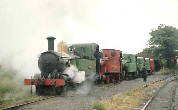 The carriage shed (to the rear of the locomotives) at St. Johns station in June 1968. The shed was destroyed by fire in 1976.