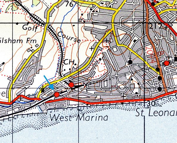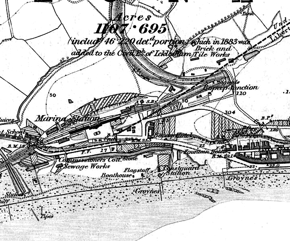 ![]() ![]() 1878 6" map. The station is shown as 'Marina', a name it never officially had. West St. Leonards station hadn't been built at this time. It opened 1 October 1887.