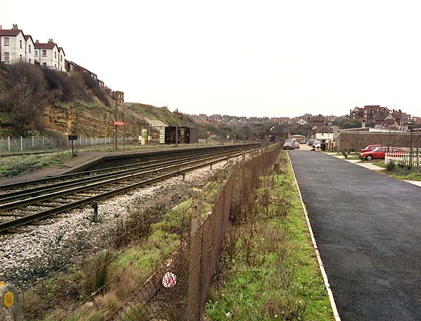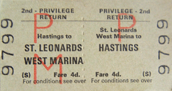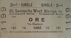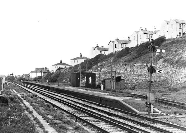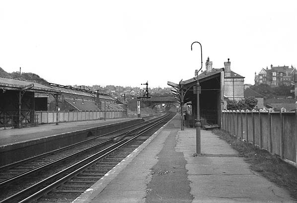 Photo by Nigel Mundy ![]() St. Leonard's West Marina station looking east in November 1982. The main station building was to the right of the fence. Note the red signs on the down platform telling passengers 'do not alight here'. The platform was retained for railway staff.