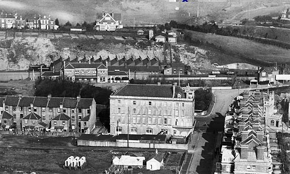 ![]() St. Leonards West Marina station from the air in February 1920. The engine shed with its north light roof is seen to the rear of the station.