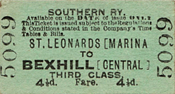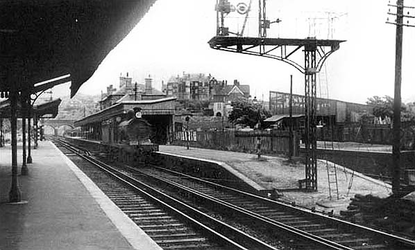 Photo received from Ian Mantel ![]() St. Leonards West Marina station looking east in 1950 as a loco runs light through the up platform. The large triangular cattle dock is seen behind the platform; it was served by three sidings, one either side and one end on to the dock.